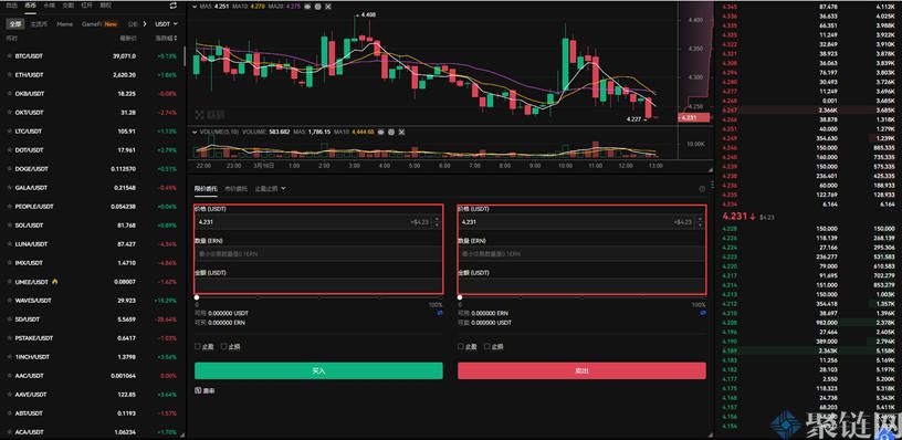 3、点击交易对后会出现交易界面,根据需求购买和交易ERN币