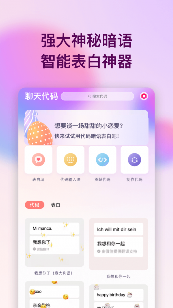 表白代码app,专业的表白神器,素材丰富,功能齐全,提供大量模板,满足用户使用需求,随时随地轻松表白,为用户带来更贴心的表白服务,多种表白代码、情书模板免费用。