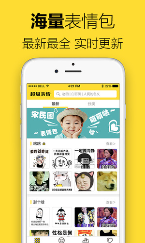 超级表情包app是一个超级好玩的表情App,超级表情包app超过100,000个表情,真正的海量表情全球首发,超级表情包app天天更新,张张精彩,专属表情随心淘,再也不用担心跟别人表情雷同了。超级表情包app每5分钟更新一组新表情包,让你用表情时间和朋友讨论当前热门话题。超级表情包,让每个小伙伴都能轻松快乐的用图说话!!!