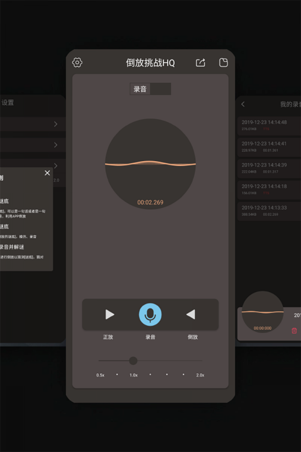 倒放挑战软件是一款可以使声音倒放的手机应用,倒放挑战软件既可以录制语音倒放,也可以插入一段音频,包括音乐进行倒放,效果虽然不如视频倒放那么连贯,但听起来还是有一种独特的乐趣,倒放挑战app让你可以聆听不一样!