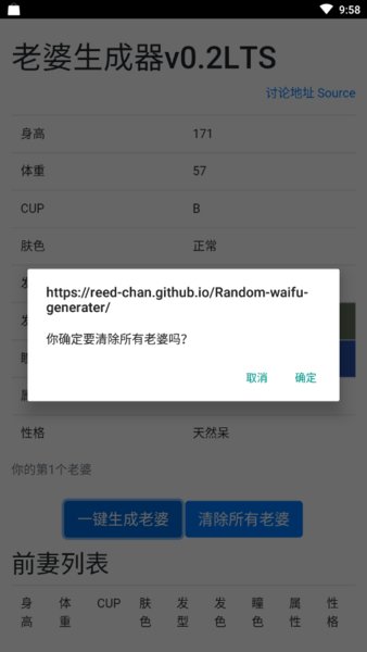 老婆生成器最新版简介老婆生成器游戏可以为你一键生成老婆的身高、体重、cup、肤色、发型、瞳色、属性,甚至既然还有性格什么的,统统带给你安排妥妥的!这个页面小游戏就只有一个可以点击的地方,就是一键生成老婆。