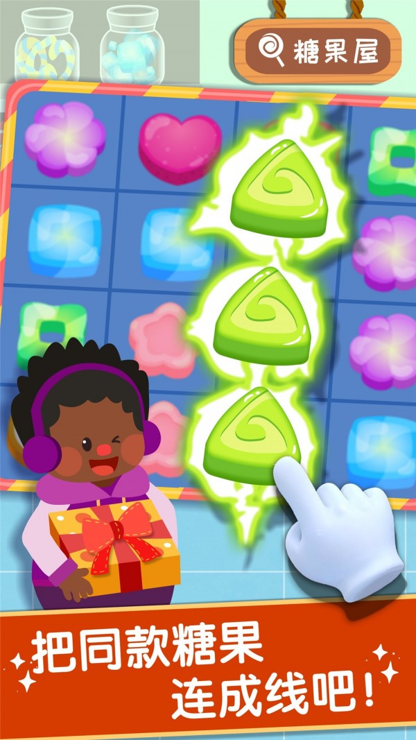 买点糖果解解腻。红的黄的绿的,好多糖果。打包糖果的秘诀是:一笔连出3颗及以上的同款糖果,怎样才能更快打包?仔细思考哦。