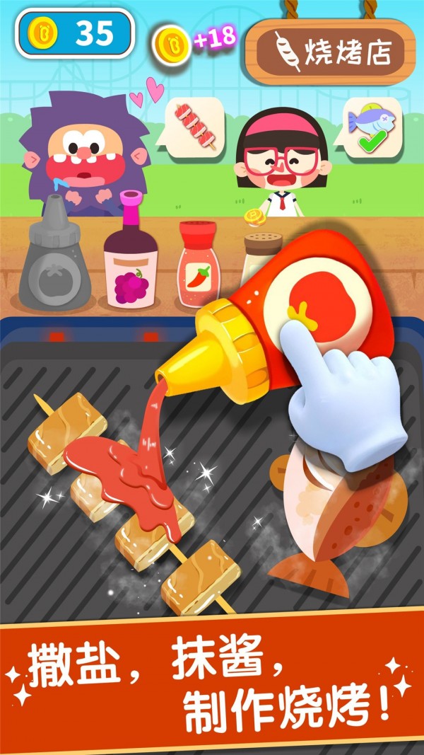 先到烧烤摊瞧瞧。哇,在烤香肠和蘑菇。宝宝为香肠抹上酸甜的番茄酱,给蘑菇洒点盐和辣椒粉调味。滋滋滋,好香啊~