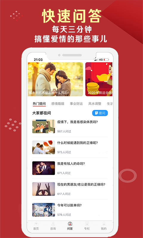 她测app是一个专注为帮助女性解决生活、工作、情感问题的服务产品,致力打造幸福女性。为女性用户提供包括情感咨询,工作财运,择吉择日,宝宝起名取名、风水转运等各类服务,签约了精通传统生辰八字算命、西方塔罗占卜,星盘测运、六爻算卦、手相面相、紫微斗数、奇门遁甲、梅花易数等各类术数的权威老师。