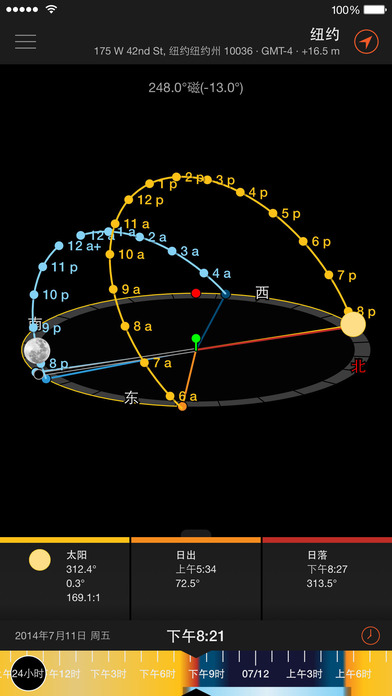 特色1.太阳和月亮的方位及高度.日出日落.阴影比.月出月落.月相及照明%.曙/暮光时间.夏/冬至太阳路径.春/秋分太阳路径.黄金时段.蓝色时段.过中天等;
