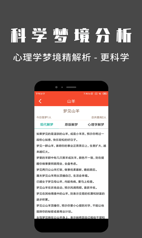 3、【科学解梦】现代心理学与中西结合的解梦结果,尊重原版周易周公解梦的神秘也融合西方解梦理论,参考弗洛伊德的《梦的解析》,《敦煌本梦书》、《梦林玄解》等众多解梦文献,给您科学合理的梦境分析。让你快速的了解自己的梦境内容。