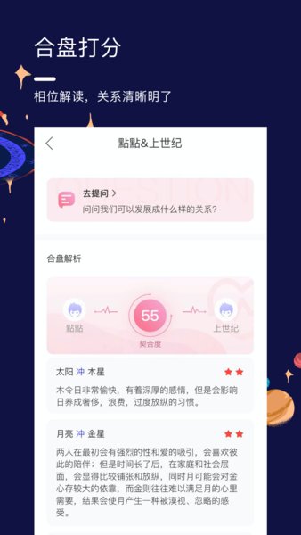 软件亮点独特的开放式组合命运分数功能,对两个人的命运进行数字评估,公开显示分数详情,让您知道它是什么