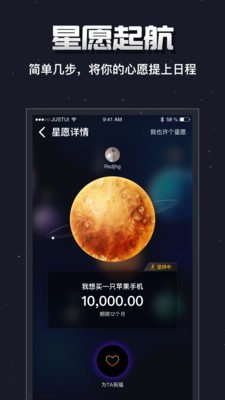 界面炫酷:外太空实景页面设计,一个星球代表一个心愿,页面切换操作具有很强的科技感,让用户有种身临其境的感觉。