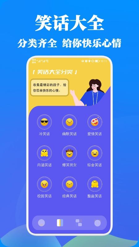下载(需通过36o手机助手安装) 大小:20.3M 下载:1920次 幽默段子 支 持:Android 4.2以上 分 类:趣味娱乐 大 小:20.3M 版 本:v1.1 评 分: 开发者:暂无 下载量:1920次 发 布:2022-01-09 12:56 手机扫码免费下载 #幽默段子截图 #幽默段子简介 幽默段子app是一款分类齐全的笑话段子软件,每天给你带来快乐,这里的各类段子很全面,用户可以更好的知晓最全的笑话,搜罗全网热点笑话、短视频、GIF动图等优质内容,每天只要看上一分钟,就能开心的笑上一整天,把所有不愉快的事情抛之脑后!软件功能1、每天一个精选段子,让你在平日的生活里多一份笑容;2、每天精选各种幽默段子,给你天天好心情;3、趣味性很强,让你的工作生活闲暇之余生活更有趣。更新日志