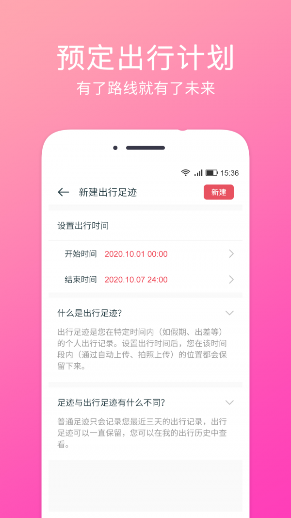 3,可以新建出行足迹,设置出行时间,您在该时间段内,通过自动上传,拍照上传的位置都会保留下来