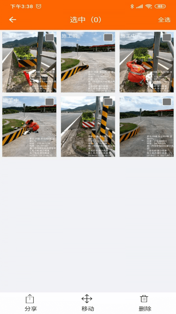 2、工程施工拍照,做施工记号、加水印:记录经纬度,地理位置,天气,工程,时间等信息