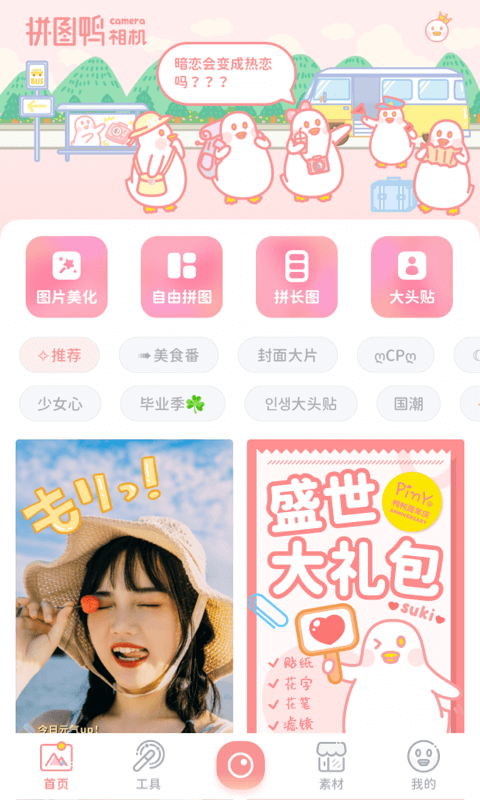 拼图鸭相机安卓版是非常好用的美颜相机类型软件,内部的多种滤镜与板块元素相当繁多,并且所有的全部免费使用,让你随时随地打开软件就能照出最的自己,其中编辑图片的功能也相当繁多丰富,设置编辑也相当简单易懂。