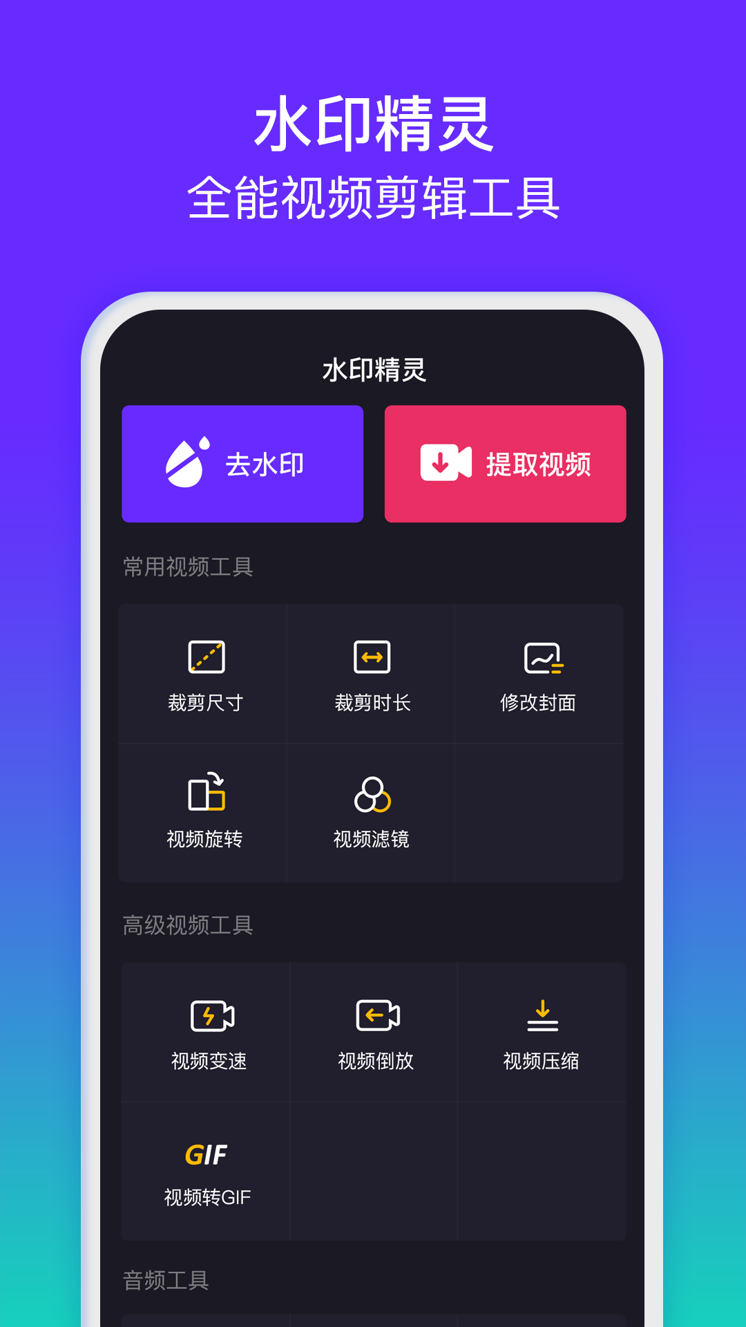 水印精灵app是一款短视频编辑软件,主要为用户提供视频去水印、视频提取mp3、视频裁剪、视频更换封面等视频处理服务。