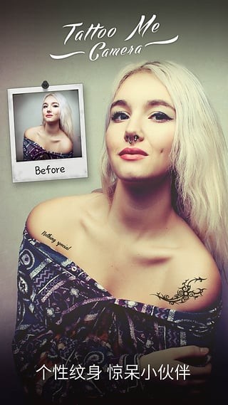 纹身相机手机版简介:手机拍照软件,一张图太单调了,可以加纹身,不需要纹身,可以给你的图片加纹身图案,别人看起来像纹身,不用受纹身的痛苦.