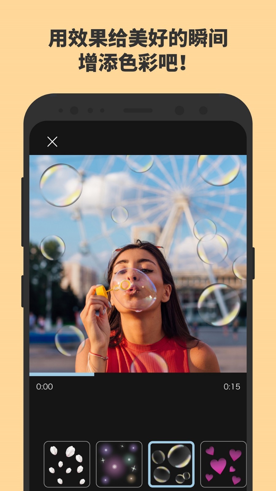 给照片加上相机动效以及花瓣、肥皂泡、心型等效果之后,短视频就做好啦。