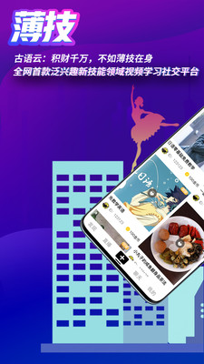 薄技是一款轻技能视频学习社交APP,具备技能才艺展示、实用技能学习、技能兴趣社交、技能创业变现4个主要功能。