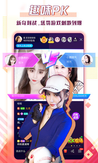 kk直播软件是一款非常有趣的手机在线直播平台,在这里你可以遇到各种各样的主播,各种类型的美女,总有你喜欢的一款,同时还有更多热门游戏直播栏目,刺激战场,全军出击,王者荣耀等,喜欢就来极光下载站体验一番吧!