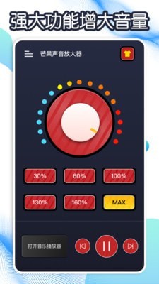 芒果声音放大器app是一款全新上线的音量管理app。当你的手机需要发出响亮的声音时,可以用芒果声音放大器app来做音响,还可以播放手机里的歌曲并最大的提高音量,不受系统声音限制,戴上耳机后效果更佳。后台运行和极低能耗,支持网易云音乐、qq音乐等多种播放器,即使锁定屏幕,软件也可以正常使用。