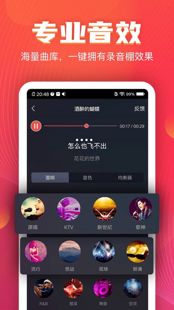 【专业音效】手机唱出专业音效,各种模式随心切换 。